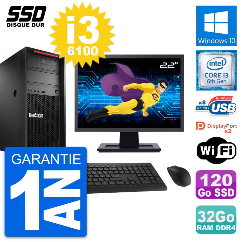 PC Tour Lenovo ThinkStation P320 MT - Intel Core i3-6100 3.7 Ghz (3 Mo) - 32 Go DDR4 - SSD 120 Go - Clef Wifi USB - Graveur DVD - Windows 10 - Livré avec Ecran 22" + clavier + souris (Marques et modèles variables) - Garantie 1 an.