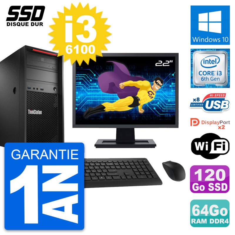 PC Tour Lenovo ThinkStation P320 MT - Intel Core i3-6100 3.7 Ghz (3 Mo) - 64 Go DDR4 - SSD 120 Go - Clef Wifi USB - Graveur DVD - Windows 10 - Livré avec Ecran 22" + clavier + souris (Marques et modèles variables) - Garantie 1 an.