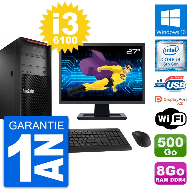 PC Tour Lenovo ThinkStation P320 MT - Intel Core i3-6100 3.7 Ghz (3 Mo) - 8 Go DDR4 - Disque Dur 3,5" 500 Go - Clef Wifi USB - Graveur DVD - Windows 10 - Livré avec Ecran 27" + clavier + souris (Marques et modèles variables) - Garantie 1 an.