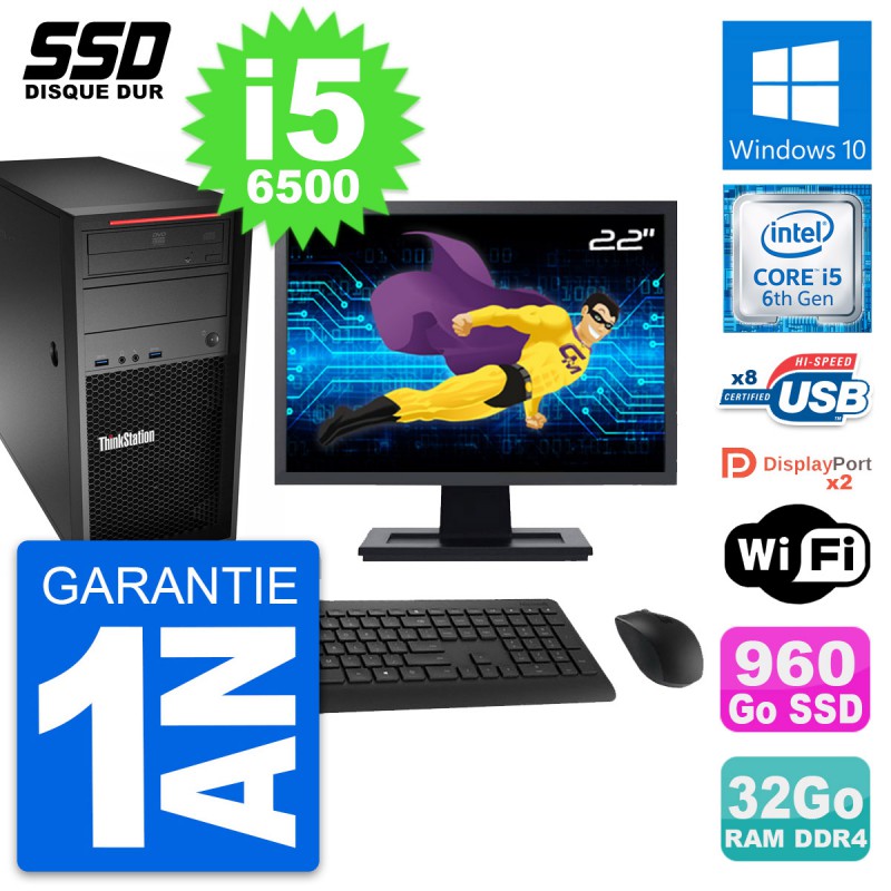 PC Tour Lenovo ThinkStation P320 MT - Intel Core i5-6500 3.2 Ghz (6 Mo) - 32 Go DDR4 - SSD 960 Go - Clef Wifi USB - Graveur DVD - Windows 10 - Livré avec Ecran 22" + clavier + souris (Marques et modèles variables) - Garantie 1 an.