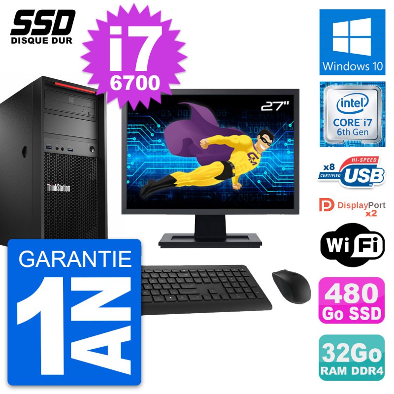 PC Tour Lenovo ThinkStation P320 MT - Intel Core i7-6700 3.4 Ghz (8 Mo) - 32 Go DDR4 - SSD 480 Go - Clef Wifi USB - Graveur DVD - Windows 10 - Livré avec Ecran 27" + clavier + souris (Marques et modèles variables) - Garantie 1 an.
