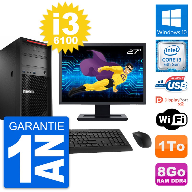 PC Tour Lenovo ThinkStation P310 MT - Intel Core i3-6100 3.7 Ghz (3 Mo) - 8 Go DDR4 - Disque Dur 3,5" 1 To - Clef Wifi USB - Graveur DVD - Windows 10 - Livré avec Ecran 27" + clavier + souris (Marques et modèles variables) - Garantie 1 an.