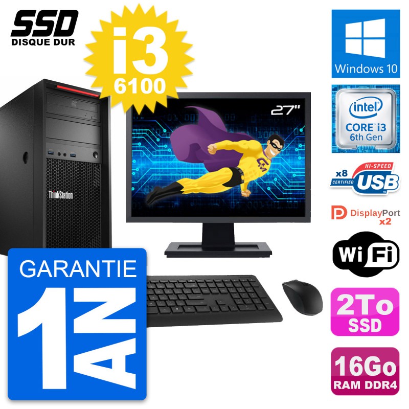 PC Tour Lenovo ThinkStation P310 MT - Intel Core i3-6100 3.7 Ghz (3 Mo) - 16 Go DDR4 - SSD 2 To - Clef Wifi USB - Graveur DVD - Windows 10 - Livré avec Ecran 27" + clavier + souris (Marques et modèles variables) - Garantie 1 an.