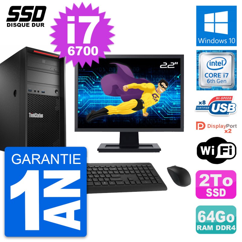 PC Tour Lenovo ThinkStation P310 MT - Intel Core i7-6700 3.4 Ghz (8 Mo) - 64 Go DDR4 - SSD 2 To - Clef Wifi USB - Graveur DVD - Windows 10 - Livré avec Ecran 22" + clavier + souris (Marques et modèles variables) - Garantie 1 an.