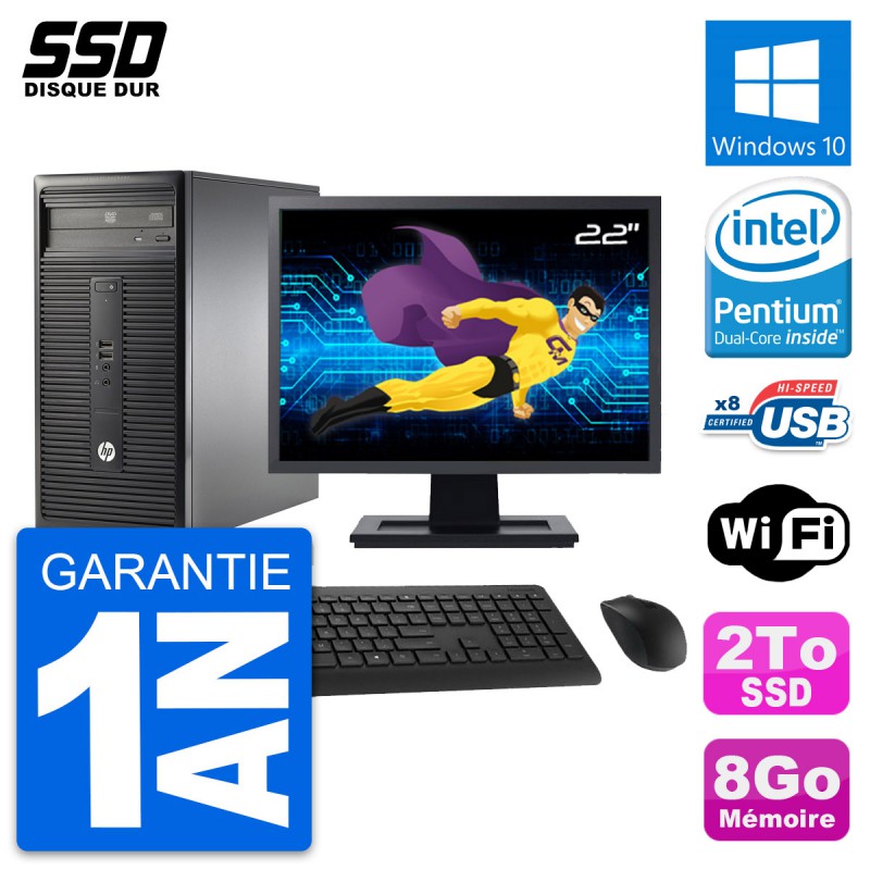 PC Tour HP 280 G1 MT - Intel Pentium Dual-Core G3220 3.0 Ghz (3 Mo) - 8 Go DDR3 - SSD 2 To - Clef Wifi USB - Graveur DVD - Windows 10 - Livré avec Ecran 22" + clavier + souris (Marques et modèles variables) - Garantie 1 an.