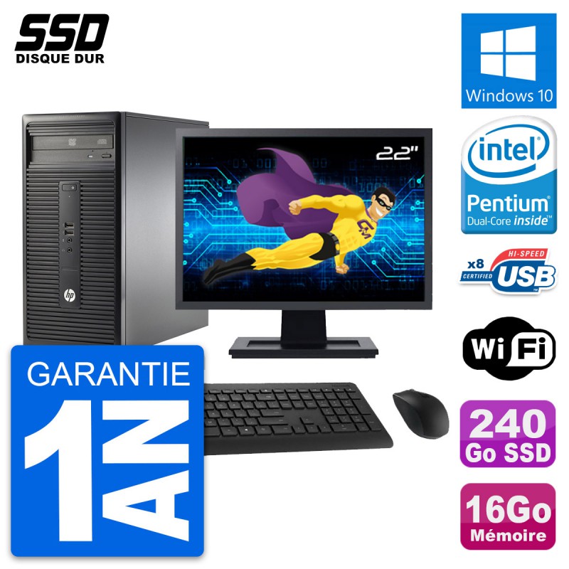 PC Tour HP 280 G1 MT - Intel Pentium Dual-Core G3220 3.0 Ghz (3 Mo) - 16 Go DDR3 - SSD 240 Go - Clef Wifi USB - Graveur DVD - Windows 10 - Livré avec Ecran 22" + clavier + souris (Marques et modèles variables) - Garantie 1 an.