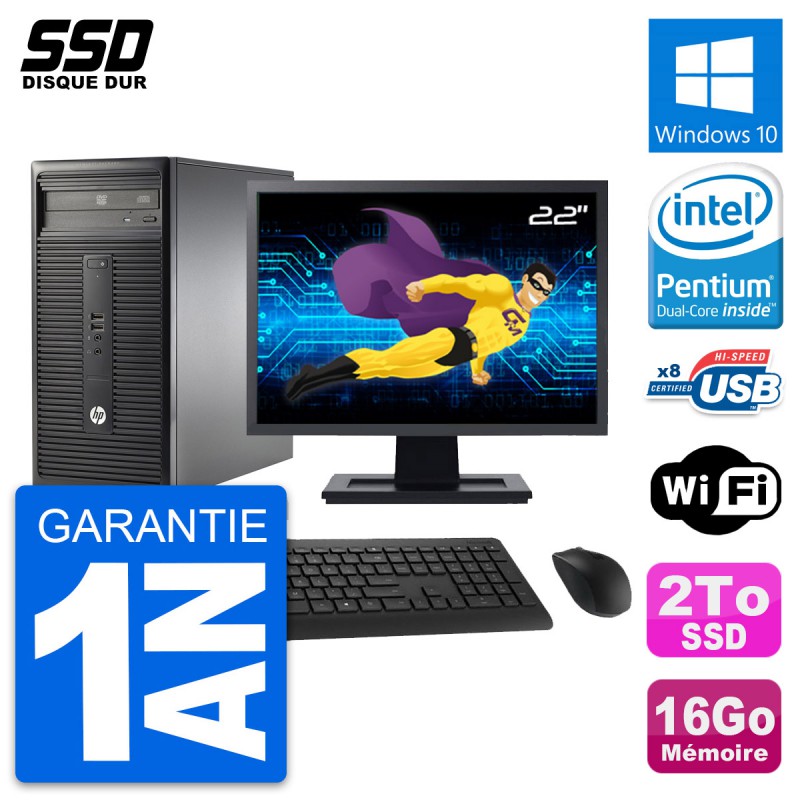 PC Tour HP 280 G1 MT - Intel Pentium Dual-Core G3220 3.0 Ghz (3 Mo) - 16 Go DDR3 - SSD 2 To - Clef Wifi USB - Graveur DVD - Windows 10 - Livré avec Ecran 22" + clavier + souris (Marques et modèles variables) - Garantie 1 an.