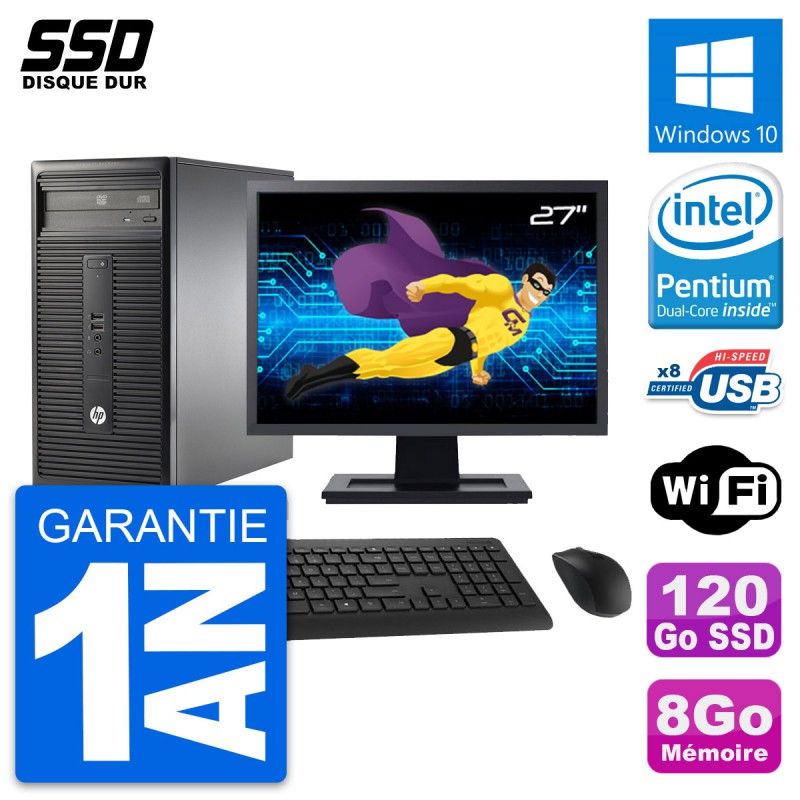 PC Tour HP 280 G1 MT - Intel Pentium Dual-Core G3220 3.0 Ghz (3 Mo) - 8 Go DDR3 - SSD 120 Go - Clef Wifi USB - Graveur DVD - Windows 10 - Livré avec Ecran 27" + clavier + souris (Marques et modèles variables) - Garantie 1 an.