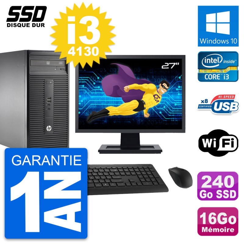 PC Tour HP 280 G1 MT - Intel Core i3-4130 3.4 Ghz (3 Mo) - 16 Go DDR3 - SSD 240 Go - Clef Wifi USB - Graveur DVD - Windows 10 - Livré avec Ecran 27" + clavier + souris (Marques et modèles variables) - Garantie 1 an.