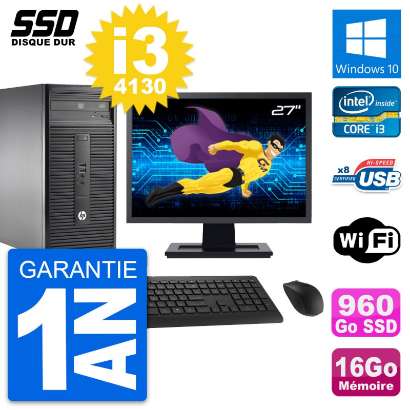 PC Tour HP 280 G1 MT - Intel Core i3-4130 3.4 Ghz (3 Mo) - 16 Go DDR3 - SSD 960 Go - Clef Wifi USB - Graveur DVD - Windows 10 - Livré avec Ecran 27" + clavier + souris (Marques et modèles variables) - Garantie 1 an.