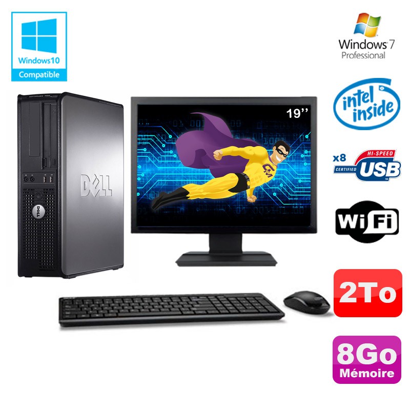 Lot PC DELL Optiplex 780 DT Intel E8400 3Ghz 8Go 2000Go WIFI Win 7 + Ecran 19"