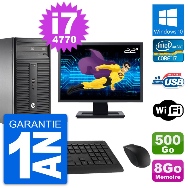 PC Tour HP 280 G1 MT - Intel Core i7-4770 3.4 Ghz (8 Mo) - 8 Go DDR3 - Disque Dur 3,5" 500 Go - Clef Wifi USB - Graveur DVD - Windows 10 - Livré avec Ecran 22" + clavier + souris (Marques et modèles variables) - Garantie 1 an.