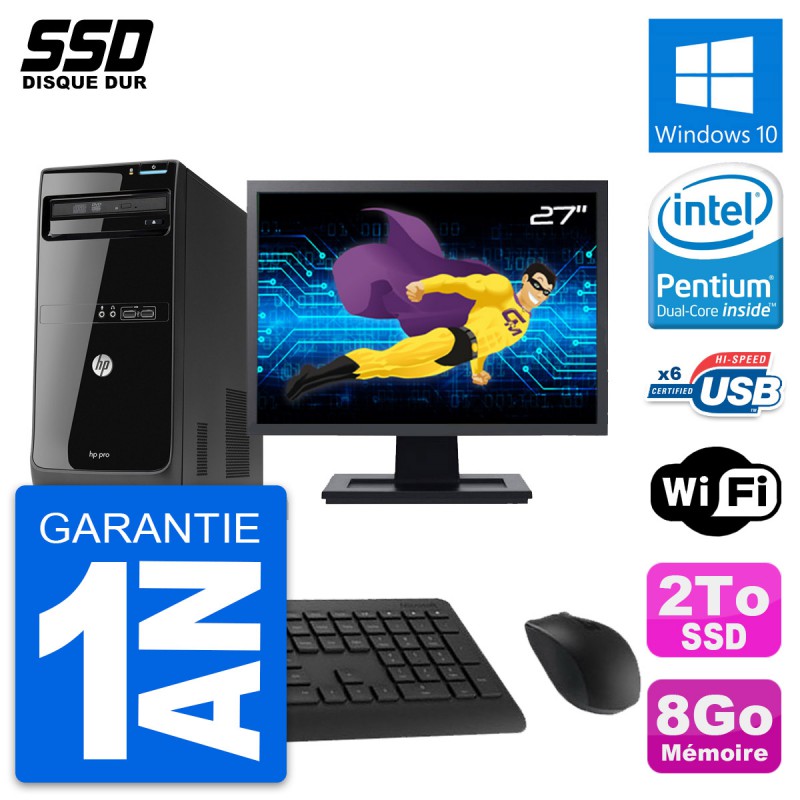 PC Tour HP Pro 3500 MT - Intel Pentium Dual-Core G2020 2.9 Ghz (3 Mo) - 8 Go DDR3 - Disque Dur SSD 2 To - Graveur DVD - Clef Wifi USB - Windows 10 - Livré avec Ecran 27" + clavier + souris (Marques et modèles variables) - Garantie 1 an.