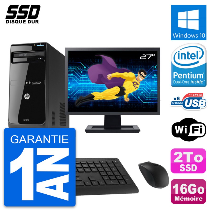 PC Tour HP Pro 3500 MT - Intel Pentium Dual-Core G2020 2.9 Ghz (3 Mo) - 16 Go DDR3 - Disque Dur SSD 2 To - Graveur DVD - Clef Wifi USB - Windows 10 - Livré avec Ecran 27" + clavier + souris (Marques et modèles variables) - Garantie 1 an.