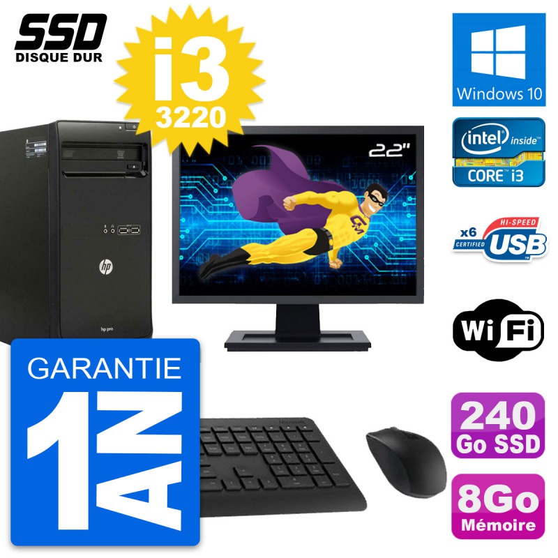PC Tour HP Pro 3500 MT Ecran 22" Core i3-3220 RAM 8Go SSD 240Go Windows 10 Wifi