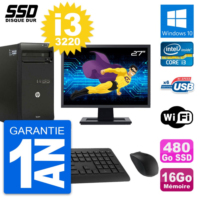 PC Tour HP Pro 3500 MT Ecran 27" Core i3-3220 RAM 16Go SSD 480Go Windows 10 Wifi