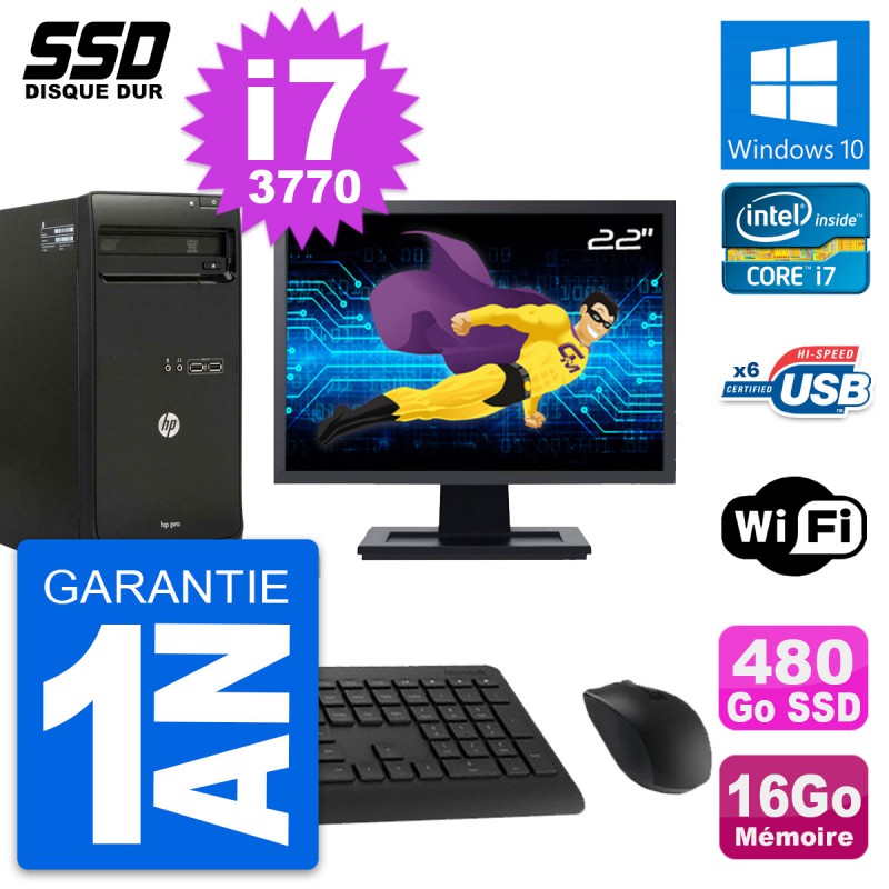 PC Tour HP Pro 3500 MT - Intel Core i7-3770 3.4 Ghz (8 Mo) - 16 Go DDR3 - Disque Dur SSD 480 Go - Graveur DVD - Clef Wifi USB - Windows 10 - Livré avec Ecran 22" + clavier + souris (Marques et modèles variables) - Garantie 1 an.