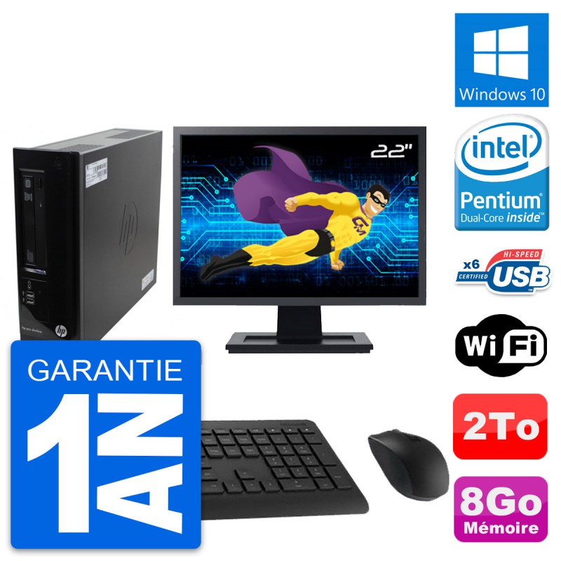 PC HP Pro 3300 SFF - Intel Pentium Dual-Core G630 2.7 Ghz (3 Mo) - 8 Go DDR3 - Disque Dur 3,5" 2 To - Graveur DVD - Clef Wifi USB - Windows 10 - Livré avec Ecran 22" + clavier + souris (Marques et modèles variables) - Garantie 1 an.