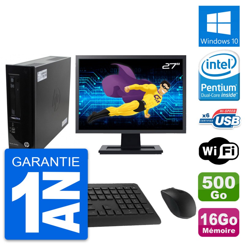 PC HP Pro 3300 SFF - Intel Pentium Dual-Core G630 2.7 Ghz (3 Mo) - 16 Go DDR3 - Disque Dur 3,5" 500 Go - Graveur DVD - Clef Wifi USB - Windows 10 - Livré avec Ecran 27" + clavier + souris (Marques et modèles variables) - Garantie 1 an.