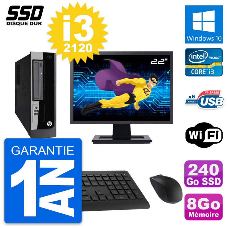 PC HP Pro 3300 SFF Ecran 22" Intel i3-2120 RAM 8Go SSD 240Go Windows 10 Wifi