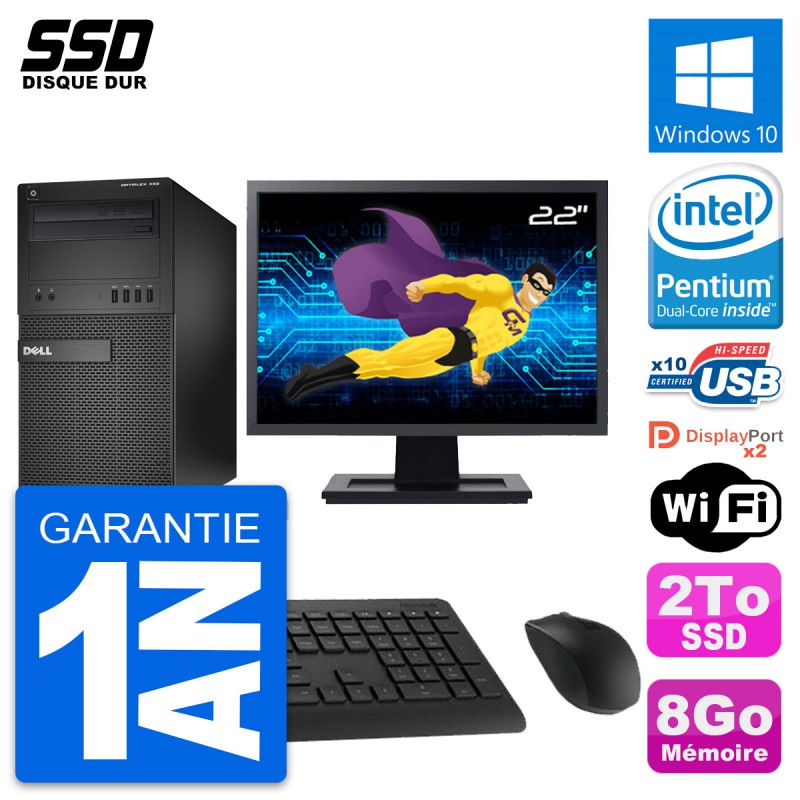 PC Tour Dell OptiPlex XE2 MT - Intel Pentium Dual-Core G3220 3.0 Ghz (3 Mo) - 8 Go DDR3 - SSD 2 To - Graveur DVD - Clef Wifi USB - Windows 10 - Livré avec Ecran 22" + clavier + souris (Marques et modèles variables) - Garantie 1 an.