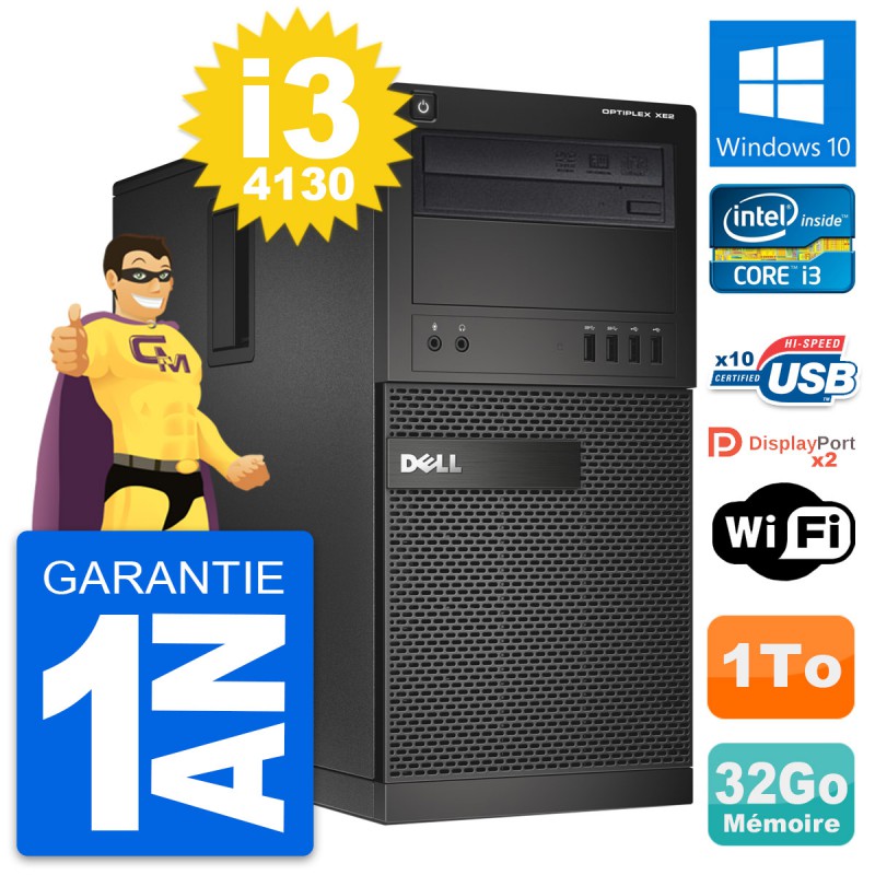 PC Tour Dell OptiPlex XE2 MT - Intel Core i3-4130 3.4 Ghz (3 Mo) - 32 Go DDR3 - Disque Dur 3,5" 1 To - Graveur DVD - Clef Wifi USB - Windows 10 - Garantie 1 an.