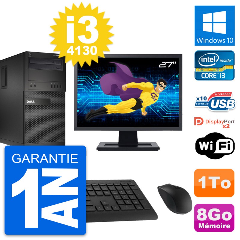 PC Tour Dell OptiPlex XE2 MT - Intel Core i3-4130 3.4 Ghz (3 Mo) - 8 Go DDR3 - Disque Dur 3,5" 1 To - Graveur DVD - Clef Wifi USB - Windows 10 - Livré avec Ecran 27" + clavier + souris (Marques et modèles variables) - Garantie 1 an.