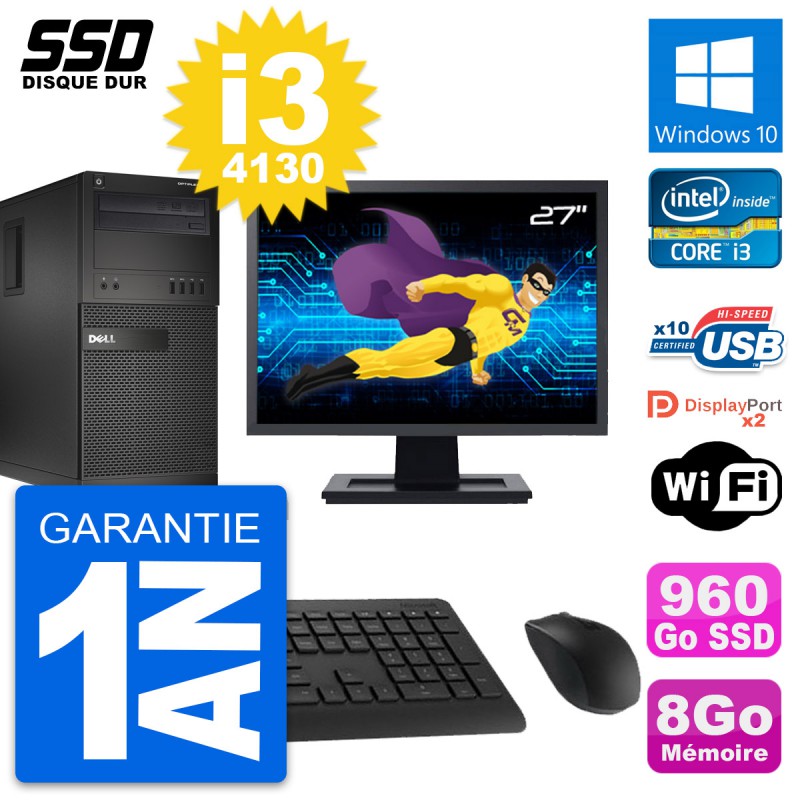 PC Tour Dell OptiPlex XE2 MT - Intel Core i3-4130 3.4 Ghz (3 Mo) - 8 Go DDR3 - SSD 960 Go - Graveur DVD - Clef Wifi USB - Windows 10 - Livré avec Ecran 27" + clavier + souris (Marques et modèles variables) - Garantie 1 an.