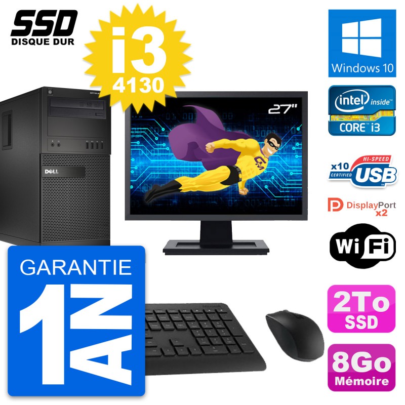 PC Tour Dell OptiPlex XE2 MT - Intel Core i3-4130 3.4 Ghz (3 Mo) - 8 Go DDR3 - SSD 2 To - Graveur DVD - Clef Wifi USB - Windows 10 - Livré avec Ecran 27" + clavier + souris (Marques et modèles variables) - Garantie 1 an.