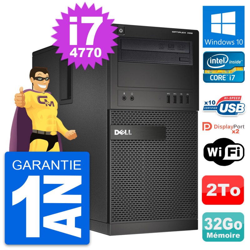 PC Tour Dell OptiPlex XE2 MT - Intel Core i7-4770 3.4 Ghz (8 Mo) - 32 Go DDR3 - Disque Dur 3,5" 2 To - Graveur DVD - Clef Wifi USB - Windows 10 - Garantie 1 an.