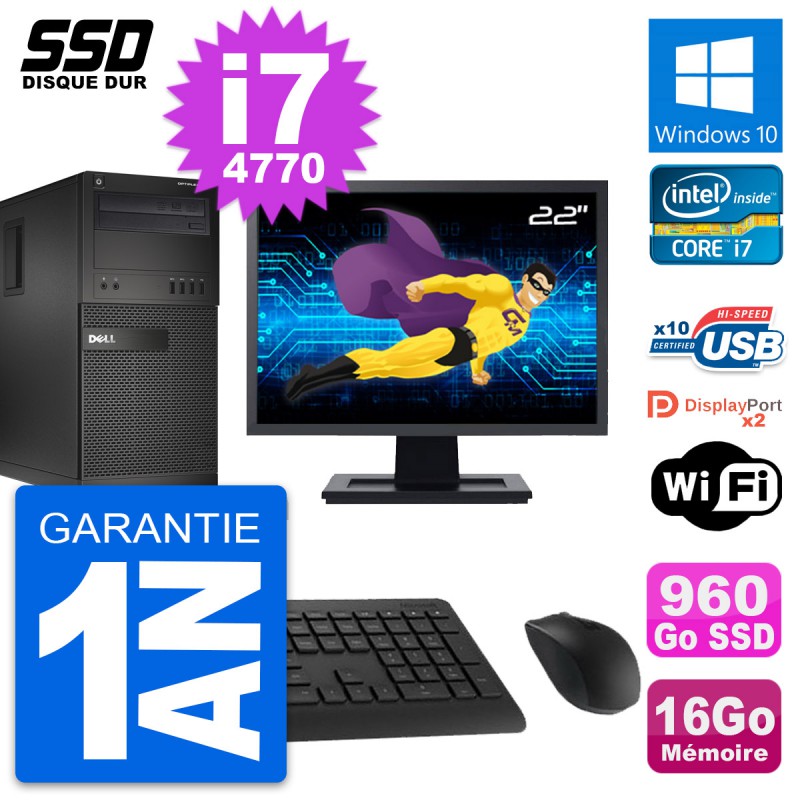 PC Tour Dell OptiPlex XE2 MT - Intel Core i7-4770 3.4 Ghz (8 Mo) - 16 Go DDR3 - SSD 960 Go - Graveur DVD - Clef Wifi USB - Windows 10 - Livré avec Ecran 22" + clavier + souris (Marques et modèles variables) - Garantie 1 an.