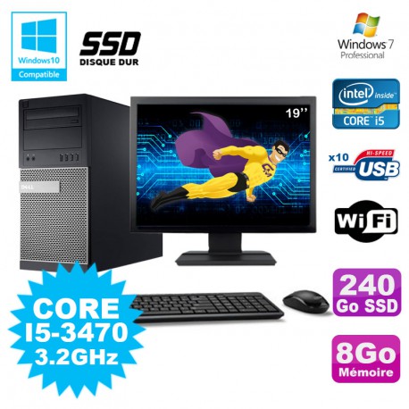 Lot PC Tour Dell 790 I5-3470 3.2Ghz 8Go 240Go SSD DVD WIFI Win 7 + Ecran 19"