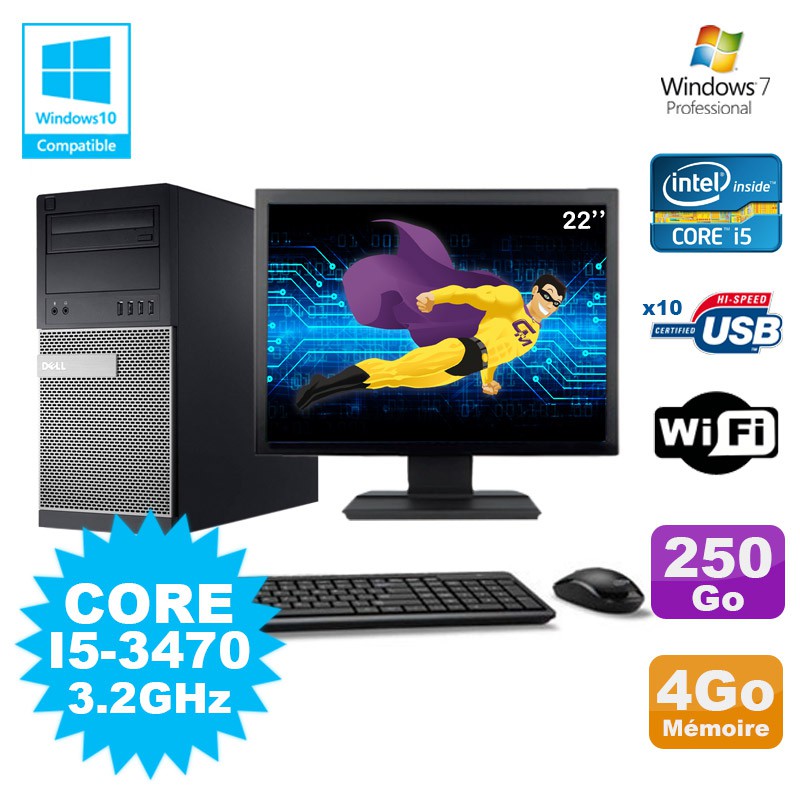 Lot PC Tour Dell 790 Intel I5-3470 3.2Ghz 4Go 250Go DVD WIFI Win 7 + Ecran 22"