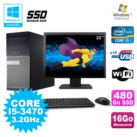 Lot PC Tour Dell 790 I5-3470 3.2Ghz 16Go 480Go SSD DVD WIFI Win 7 + Ecran 22"