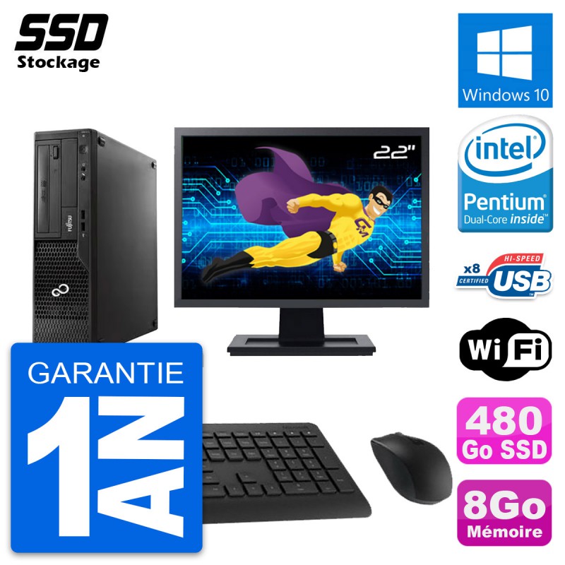 PC Fujitsu Esprimo E510 DT - Intel Pentium Dual-Core G2020 2.9 Ghz (3 Mo) - 8 Go DDR3 - SSD 480 Go - Graveur DVD - Clef Wifi USB - Windows 10 - Livré avec Ecran 22" + clavier + souris (Marques et modèles variables) - Garantie 1 an.