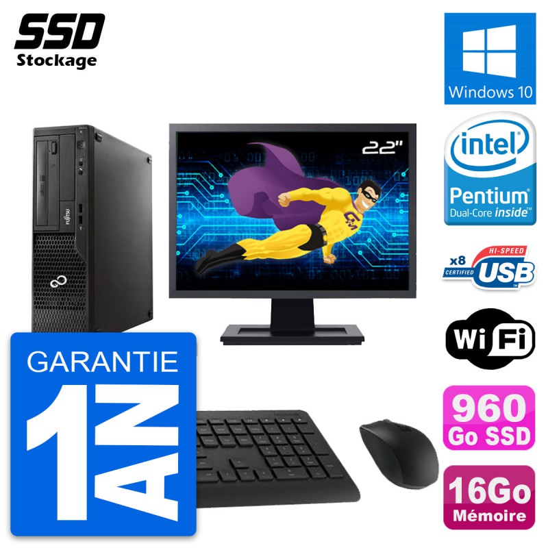 PC Fujitsu Esprimo E510 DT - Intel Pentium Dual-Core G2020 2.9 Ghz (3 Mo) - 16 Go DDR3 - SSD 960 Go - Graveur DVD - Clef Wifi USB - Windows 10 - Livré avec Ecran 22" + clavier + souris (Marques et modèles variables) - Garantie 1 an.