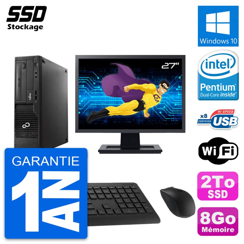 PC Fujitsu Esprimo E510 DT - Intel Pentium Dual-Core G2020 2.9 Ghz (3 Mo) - 8 Go DDR3 - SSD 2 To - Graveur DVD - Clef Wifi USB - Windows 10 - Livré avec Ecran 27" + clavier + souris (Marques et modèles variables) - Garantie 1 an.