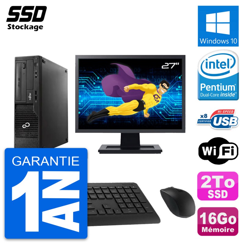 PC Fujitsu Esprimo E510 DT - Intel Pentium Dual-Core G2020 2.9 Ghz (3 Mo) - 16 Go DDR3 - SSD 2 To - Graveur DVD - Clef Wifi USB - Windows 10 - Livré avec Ecran 27" + clavier + souris (Marques et modèles variables) - Garantie 1 an.
