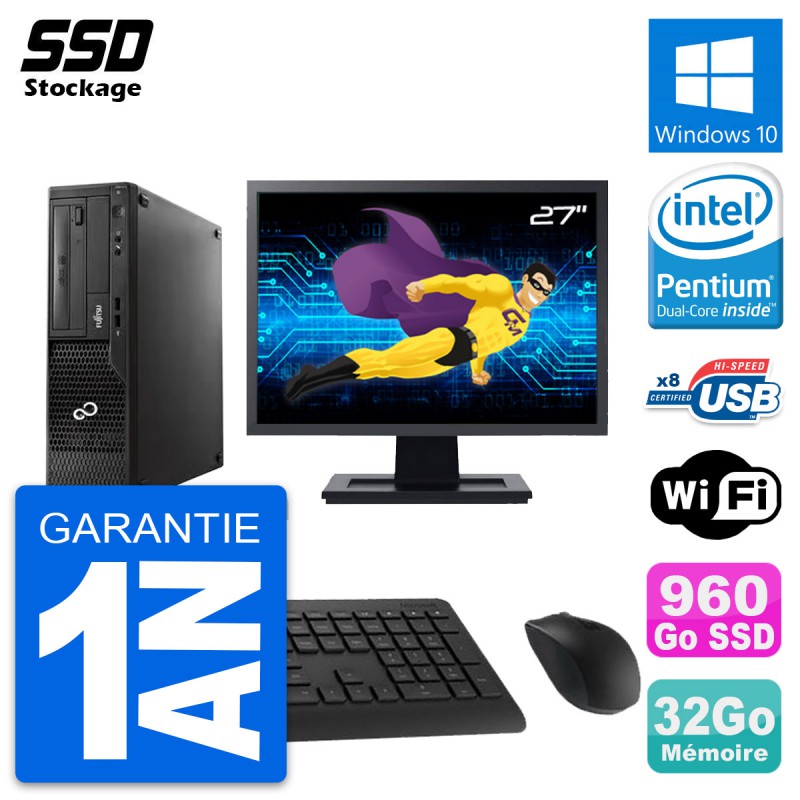 PC Fujitsu Esprimo E510 DT - Intel Pentium Dual-Core G2020 2.9 Ghz (3 Mo) - 32 Go DDR3 - SSD 960 Go - Graveur DVD - Clef Wifi USB - Windows 10 - Livré avec Ecran 27" + clavier + souris (Marques et modèles variables) - Garantie 1 an.