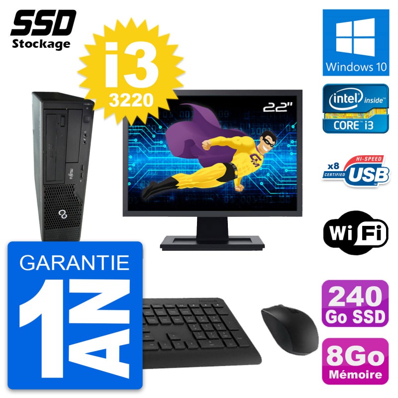 PC Fujitsu Esprimo E510 DT - Intel Core i3-3220 3.3 Ghz (3 Mo) - 8 Go DDR3 - SSD 240 Go - Graveur DVD - Clef Wifi USB - Windows 10 - Livré avec Ecran 22" + clavier + souris (Marques et modèles variables) - Garantie 1 an.