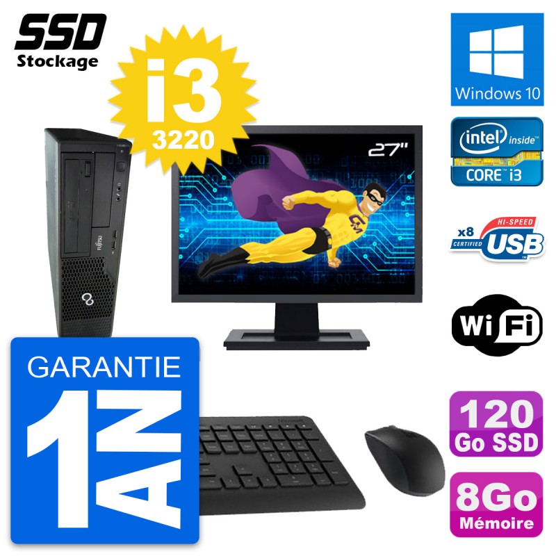 PC Fujitsu Esprimo E510 DT - Intel Core i3-3220 3.3 Ghz (3 Mo) - 8 Go DDR3 - SSD 120 Go - Graveur DVD - Clef Wifi USB - Windows 10 - Livré avec Ecran 27" + clavier + souris (Marques et modèles variables) - Garantie 1 an.