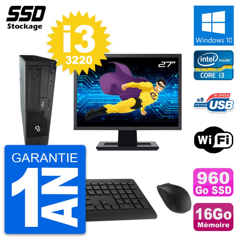PC Fujitsu Esprimo E510 DT - Intel Core i3-3220 3.3 Ghz (3 Mo) - 16 Go DDR3 - SSD 960 Go - Graveur DVD - Clef Wifi USB - Windows 10 - Livré avec Ecran 27" + clavier + souris (Marques et modèles variables) - Garantie 1 an.