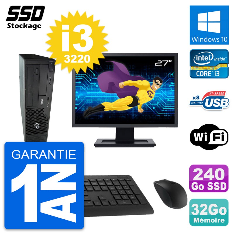 PC Fujitsu Esprimo E510 DT - Intel Core i3-3220 3.3 Ghz (3 Mo) - 32 Go DDR3 - SSD 240 Go - Graveur DVD - Clef Wifi USB - Windows 10 - Livré avec Ecran 27" + clavier + souris (Marques et modèles variables) - Garantie 1 an.
