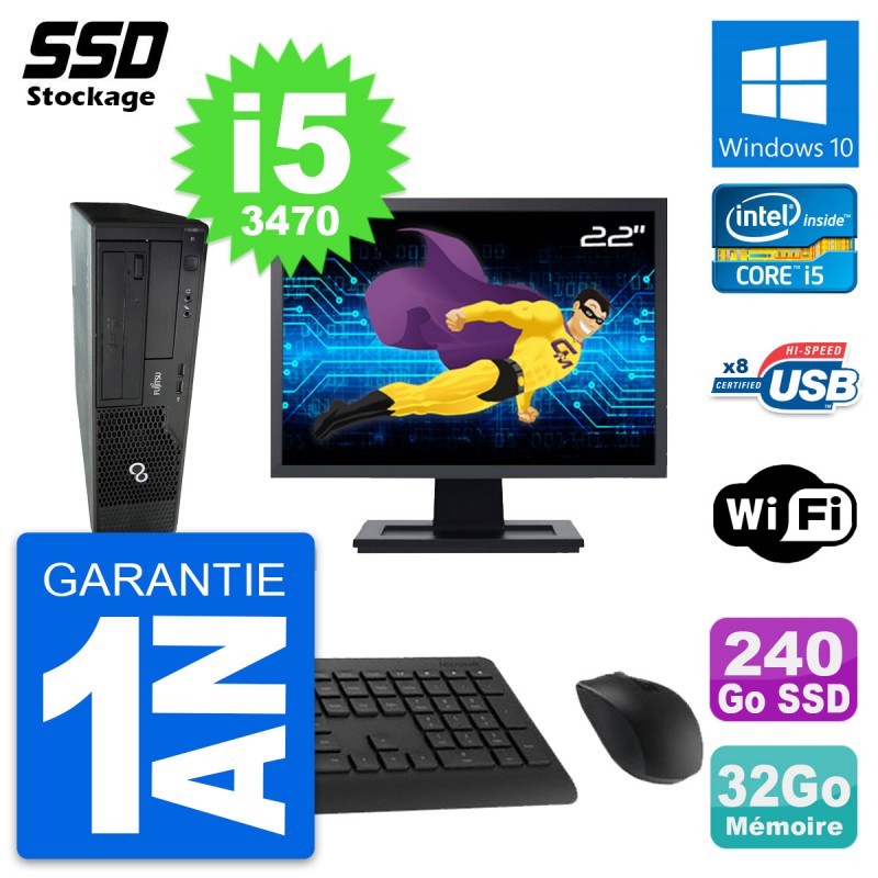 PC Fujitsu Esprimo E510 DT - Intel Core i5-3470 3.2 Ghz (6 Mo) - 32 Go DDR3 - SSD 240 Go - Graveur DVD - Clef Wifi USB - Windows 10 - Livré avec Ecran 22" + clavier + souris (Marques et modèles variables) - Garantie 1 an.