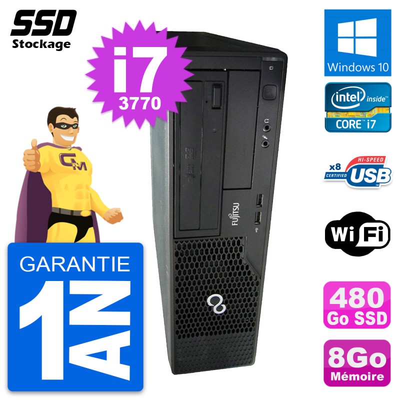 PC Fujitsu Esprimo E510 DT - Intel Core i7-3770 3.4 Ghz (8 Mo) - 8 Go DDR3 - SSD 480 Go - Graveur DVD - Clef Wifi USB - Windows 10 - Garantie 1 an.