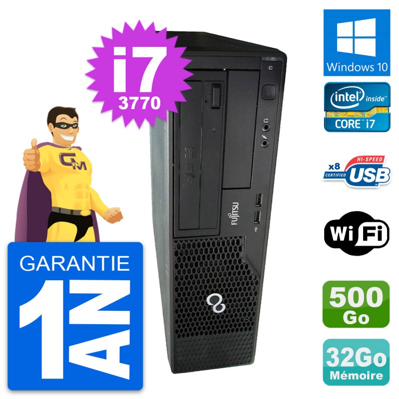 PC Fujitsu Esprimo E510 DT - Intel Core i7-3770 3.4 Ghz (8 Mo) - 32 Go DDR3 - Disque Dur 3,5" 500 Go - Graveur DVD - Clef Wifi USB - Windows 10 - Garantie 1 an.