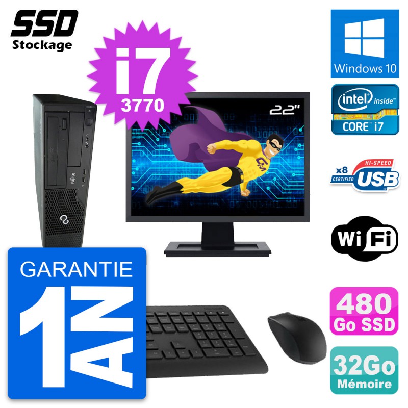 PC Fujitsu Esprimo E510 DT - Intel Core i7-3770 3.4 Ghz (8 Mo) - 32 Go DDR3 - SSD 480 Go - Graveur DVD - Clef Wifi USB - Windows 10 - Livré avec Ecran 22" + clavier + souris (Marques et modèles variables) - Garantie 1 an.