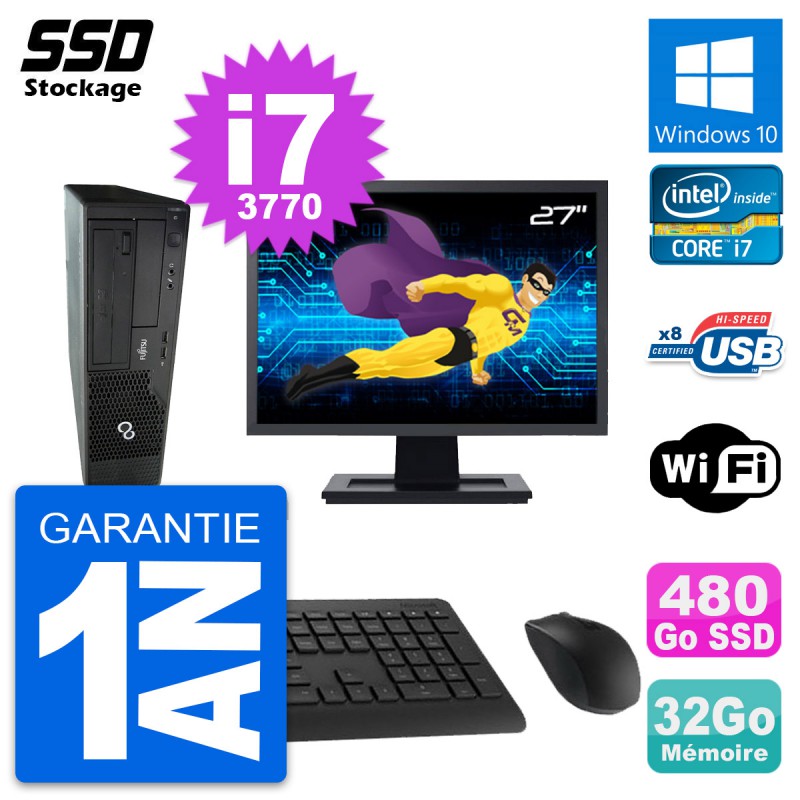 PC Fujitsu Esprimo E510 DT - Intel Core i7-3770 3.4 Ghz (8 Mo) - 32 Go DDR3 - SSD 480 Go - Graveur DVD - Clef Wifi USB - Windows 10 - Livré avec Ecran 27" + clavier + souris (Marques et modèles variables) - Garantie 1 an.