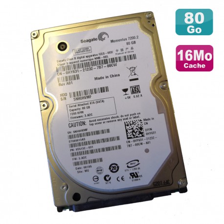 Disque dur pour ordinateur 2.5" - SATA - 80 Go - Seagate - Modèle Momentus 7K.2 / ST980813AS - P/N 9S5132-031 / 0HY631 / 21232 / 7B7 - 7200 RPM - 3.0 Gbps - Cache 16Mo - Garantie 6 mois.
