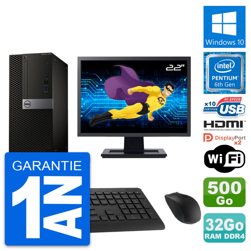 PC Tour Dell OptiPlex 5050 MT - Intel Pentium Dual-Core G4400 3.3 Ghz (3 Mo) - 32 Go DDR4 - Disque Dur 3,5" 500 Go - Clef Wifi USB - Windows 10 - Livré avec Ecran 22" + clavier + souris (Marques et modèles variables) - Garantie 1 an.